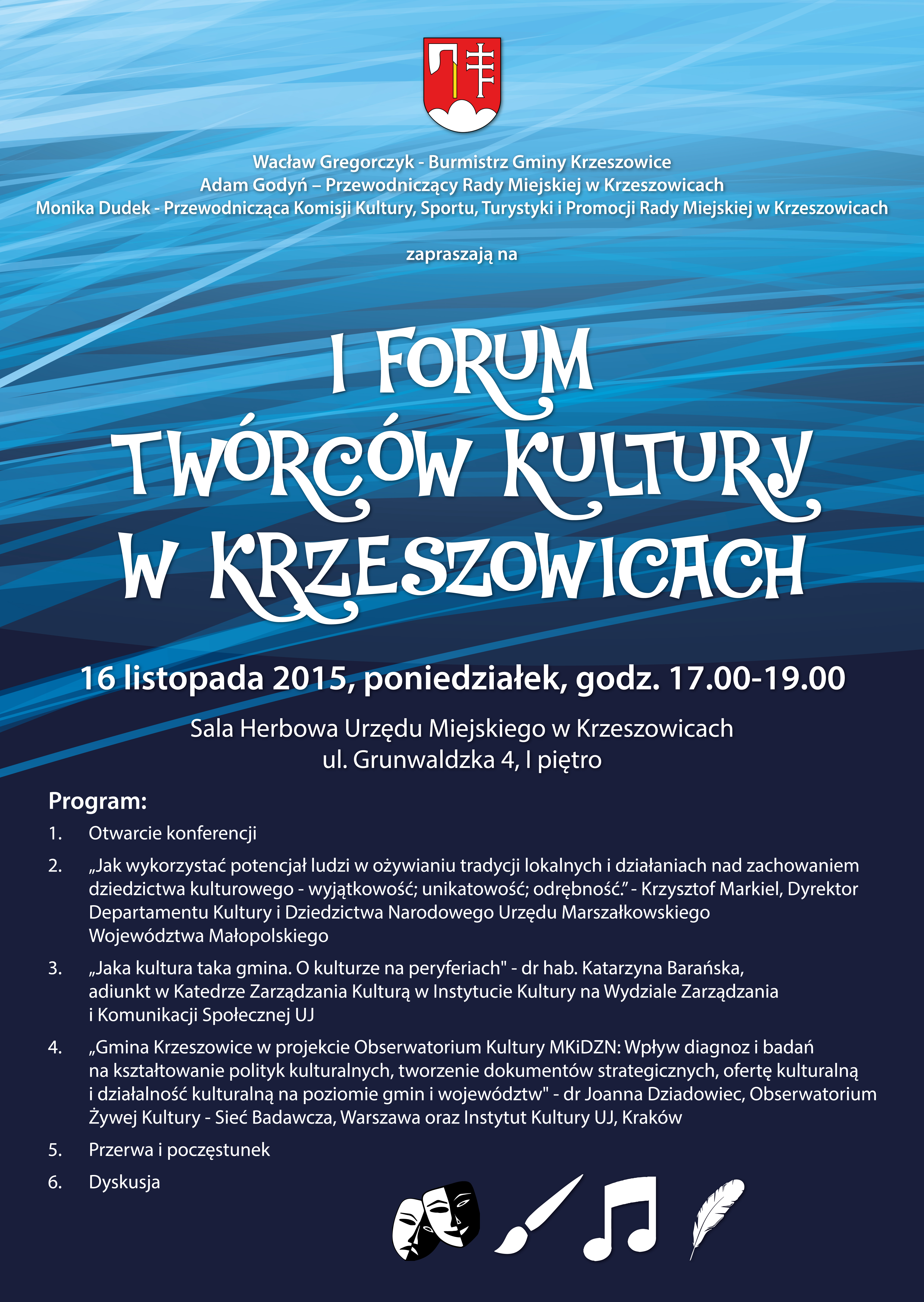 Zapraszamy do udziału w I Forum Twórców Kultury, które odbędzie się 16 listopada 2015, godz. 17.00-19.00, w Sali Herbowej Urzędu Miejskiego w Krzeszowicach, ul. Grunwaldzka 4. To okazja do spotkania się i wymiany poglądów oraz opinii dla twórców mieszkających w gminie Krzeszowice. Zaproszenie kierujemy do artystów muzyków, plastyków, tancerzy, literatów, malarzy, osób zawodowo i amatorsko zajmujących się szeroką rozumianą kulturą.